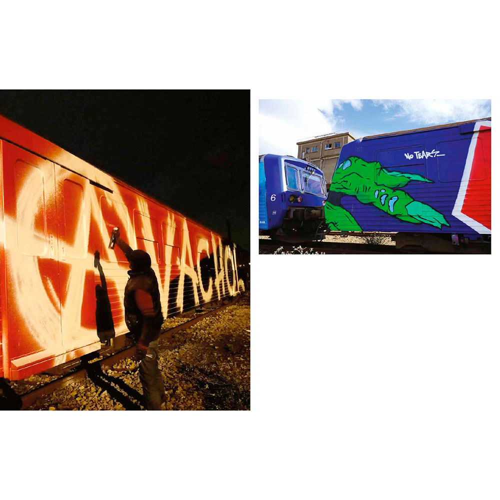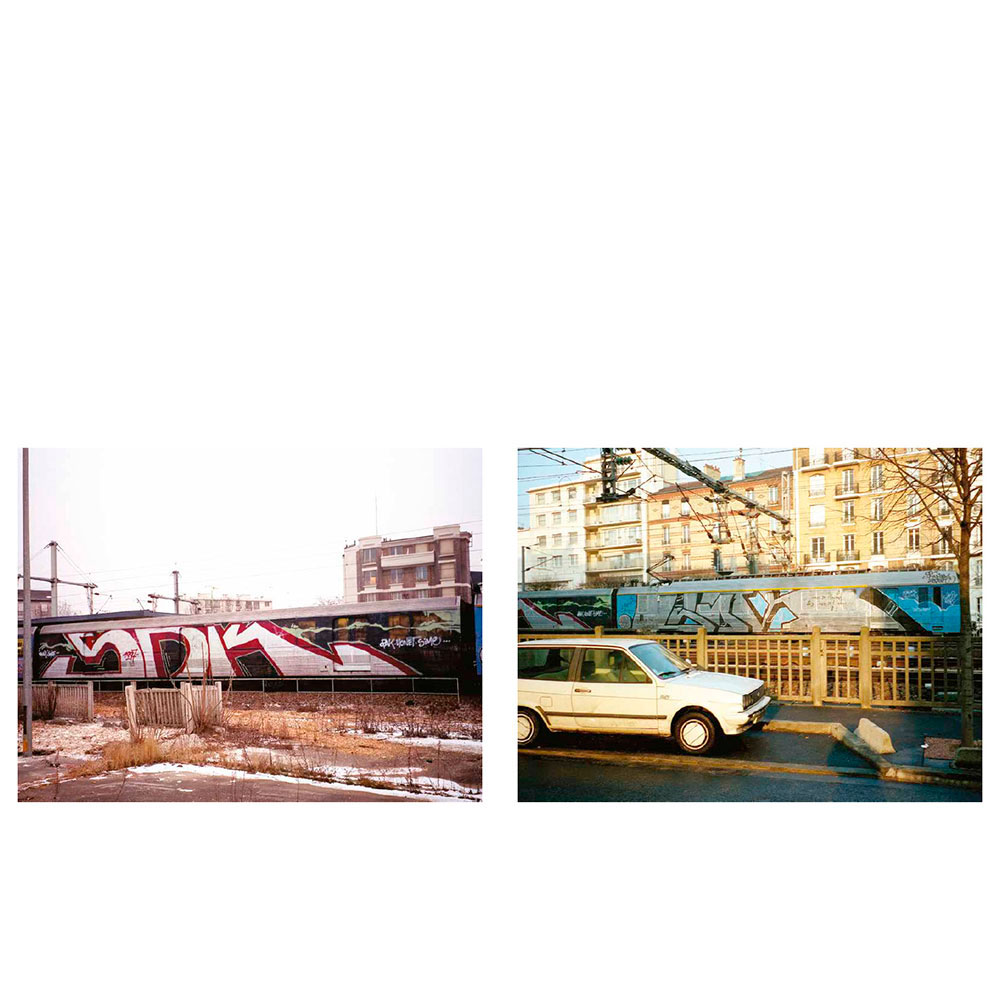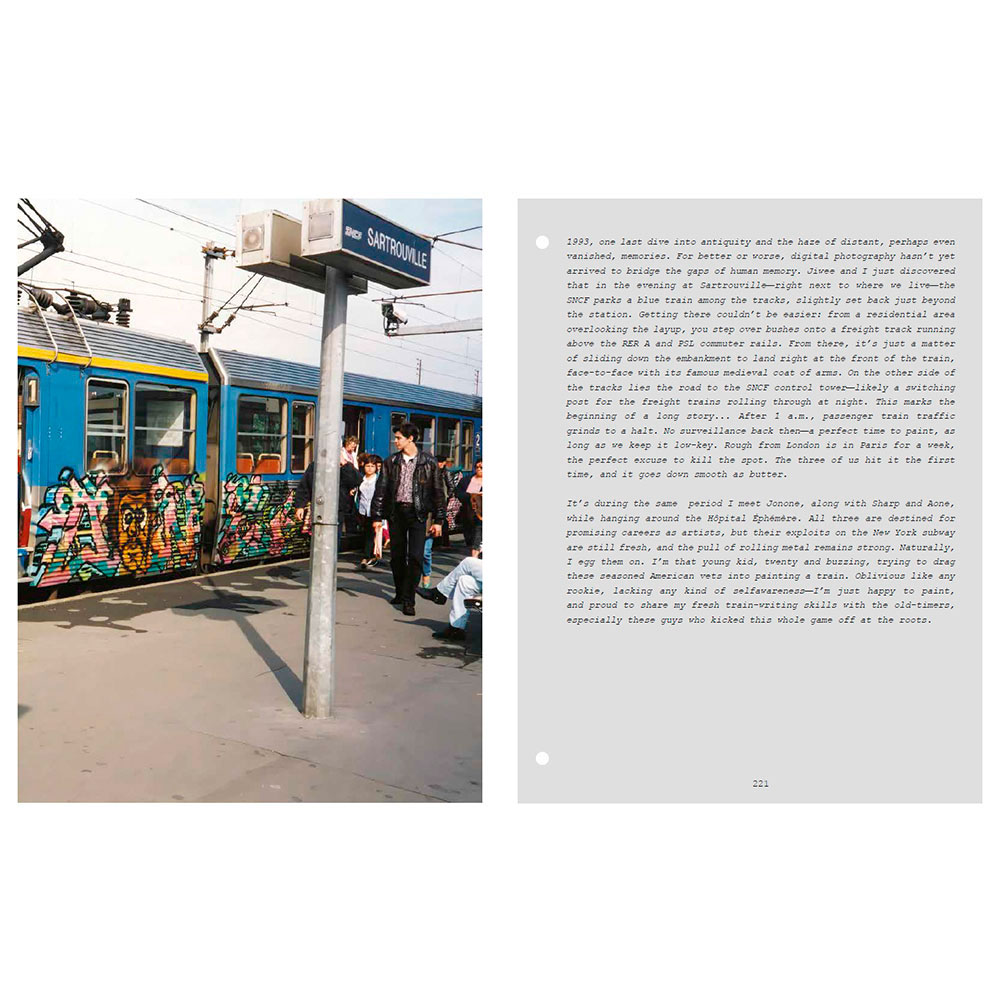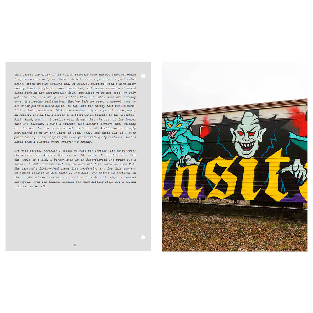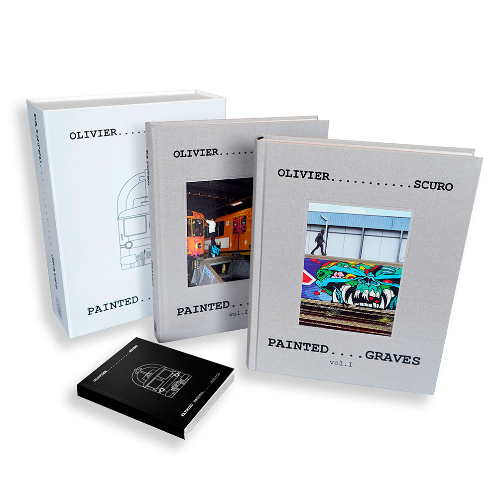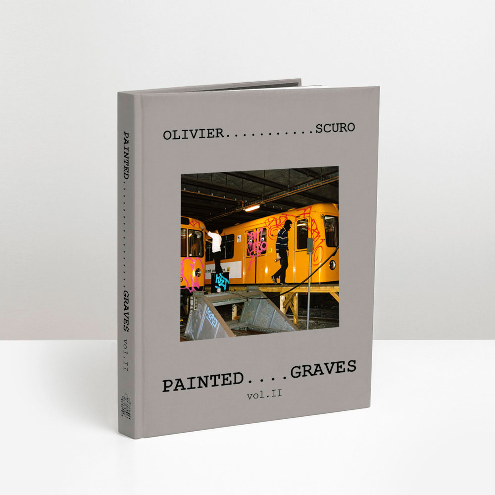 At the time, the most talented graffiti writers from the international scene join them on their missions. Among them, Risk (Finland), Stone (France), Remo (Switzerland), Math (Netherlands), Nesh (Austria), Choc (Belgium), Ruzd (Germany), and Aone (USA)… All passed away at the height of their passion. In Painted Graves Volume 2, Olivier Scuro keeps digging into graffiti archives and pays tribute to friends lost too soon: travels, flashbacks, and the quest that comes to an end. Most of these trains—painted or not—have now disappeared as well. 248 pages featuring Opak, Risk, Stone, Remo, Math, Nesh, Choc, Ruzd and Aone, but also Kaos, Micro, Lyte, Sharp, Rough, Jiwee, Inxs, Pum, Honet, Riot, Foe, Vino… Text in English and French.