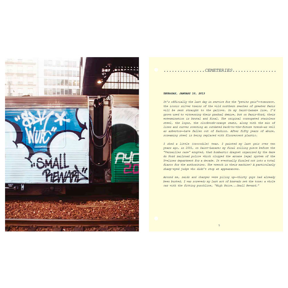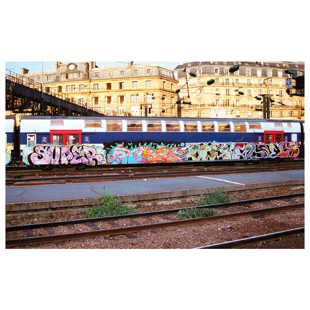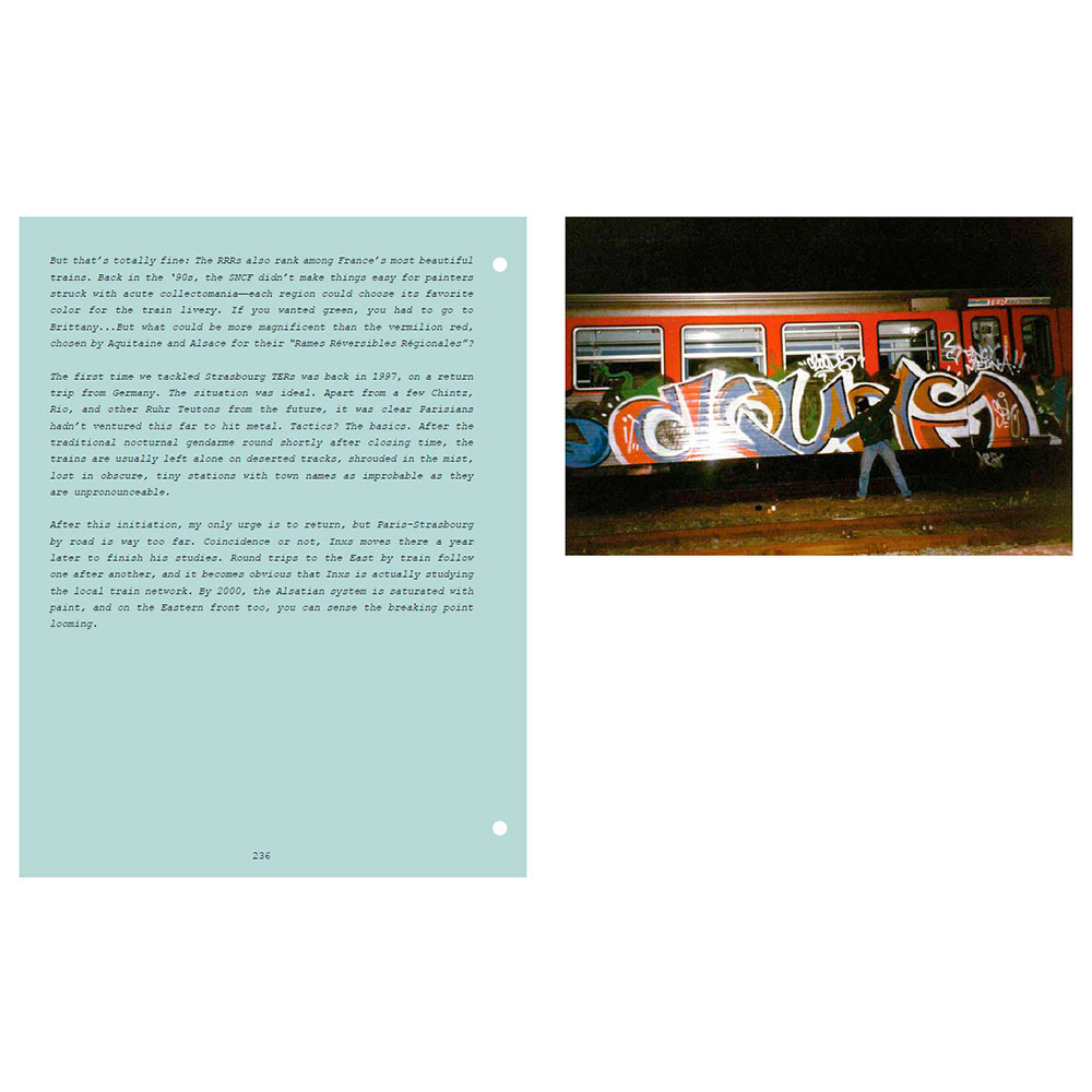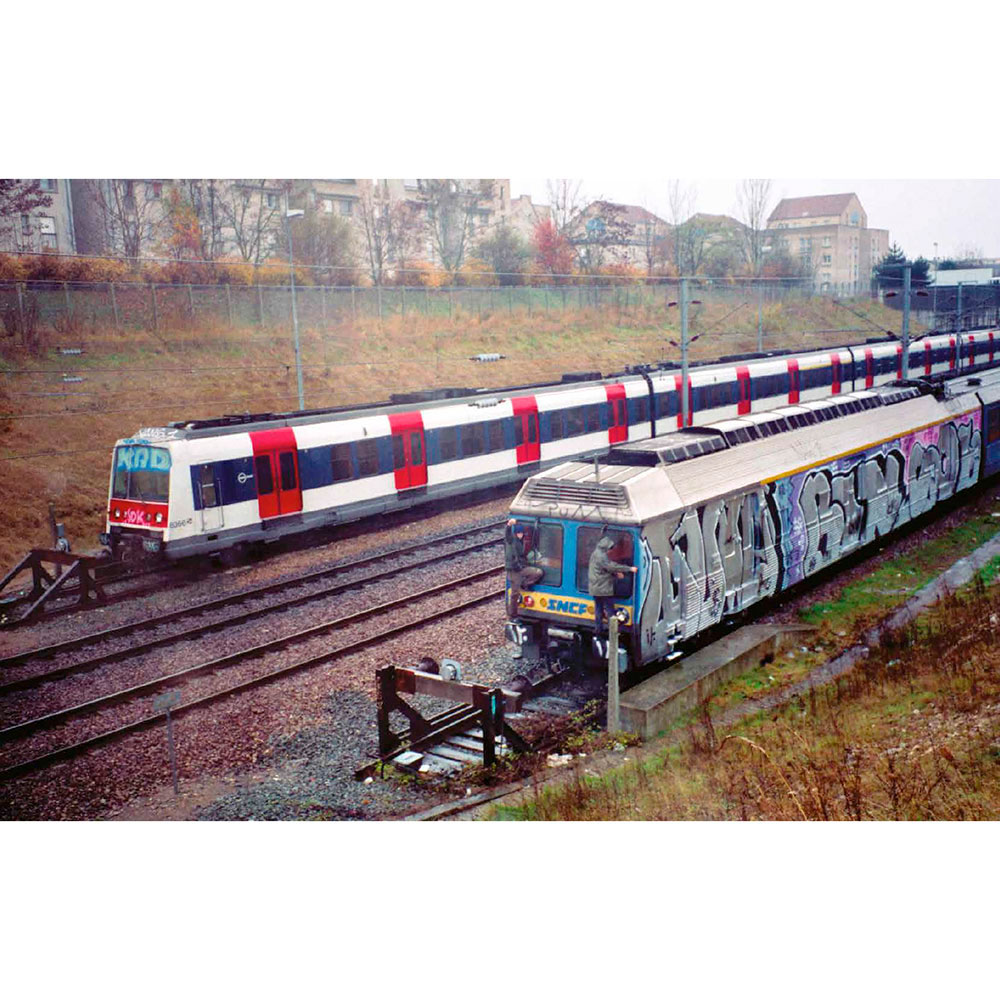 2001. After a decade of railway graffiti, Opak and the SDK crew stop painting trains in France, caught up in the legal system. Twelve years later, SNCF accelerates the scrapping of the country’s most beautiful trains and officially announces the death of the famous “petits gris.” That’s the trigger—Opak goes on a quest to paint all these legendary trains one last time. In the form of a logbook, Olivier Scuro reveals in the first volume of Painted Graves the details of this adventure and its origins in the 1990s, through numerous archive photos showcasing the works of Opak, Inxs, Honet, Pum, Fancie, Riot, Sime, Milk, Poes, Chill, Acid79, Skeme—to name just a few. A bit of urbex and adrenaline, some nostalgia… and above all, a lot of graffiti. 300 pages, text in English and French.